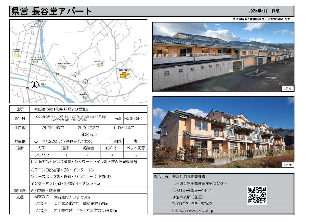 | 長谷堂 | 3階建 | 1LDK 2DK 2LDK 3LDK | 無 | 大船渡市猪川町中井沢78番地2 | ![]() |