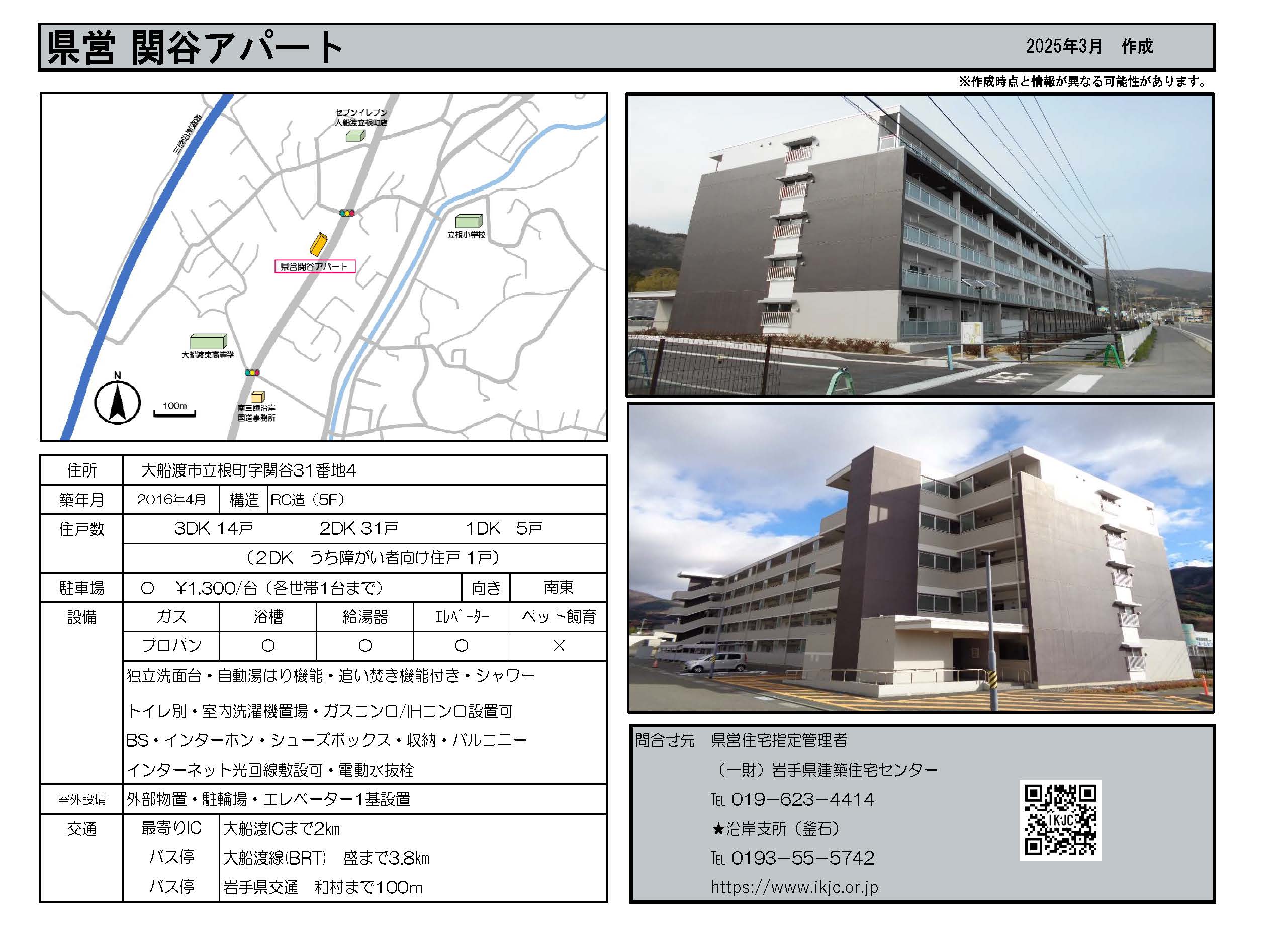 | 関谷 | 5階建 | 1DK 2DK 3DK | 有 | 大船渡市立根町字関谷31番地4 | ![]() |